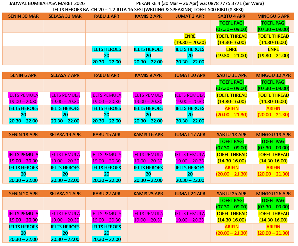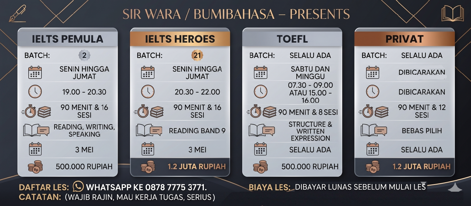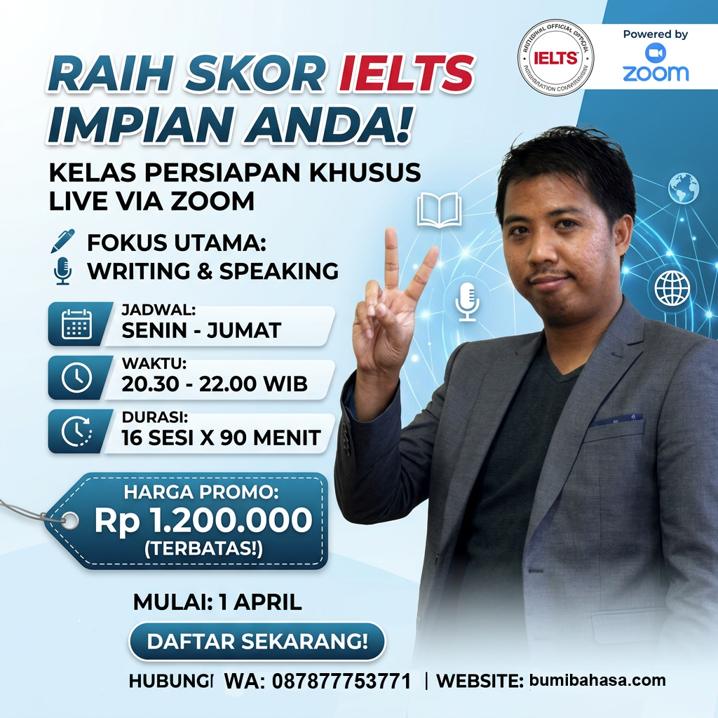 Bisa jadi anda butuh IELTS? Saya punya bendera sendiri dalam mengajar IELTS yaitu BUMIBAHASA.com dan bisa cek juga di instagram saya @bumi.bahasa. Tentunya saya sangat ahli dalam hal IELTS karena sudah mempelajari IELTS dari tahun 2006 atau sekitar 18 tahun lamanya sebagai pembelajar dan pengajar IELTS.