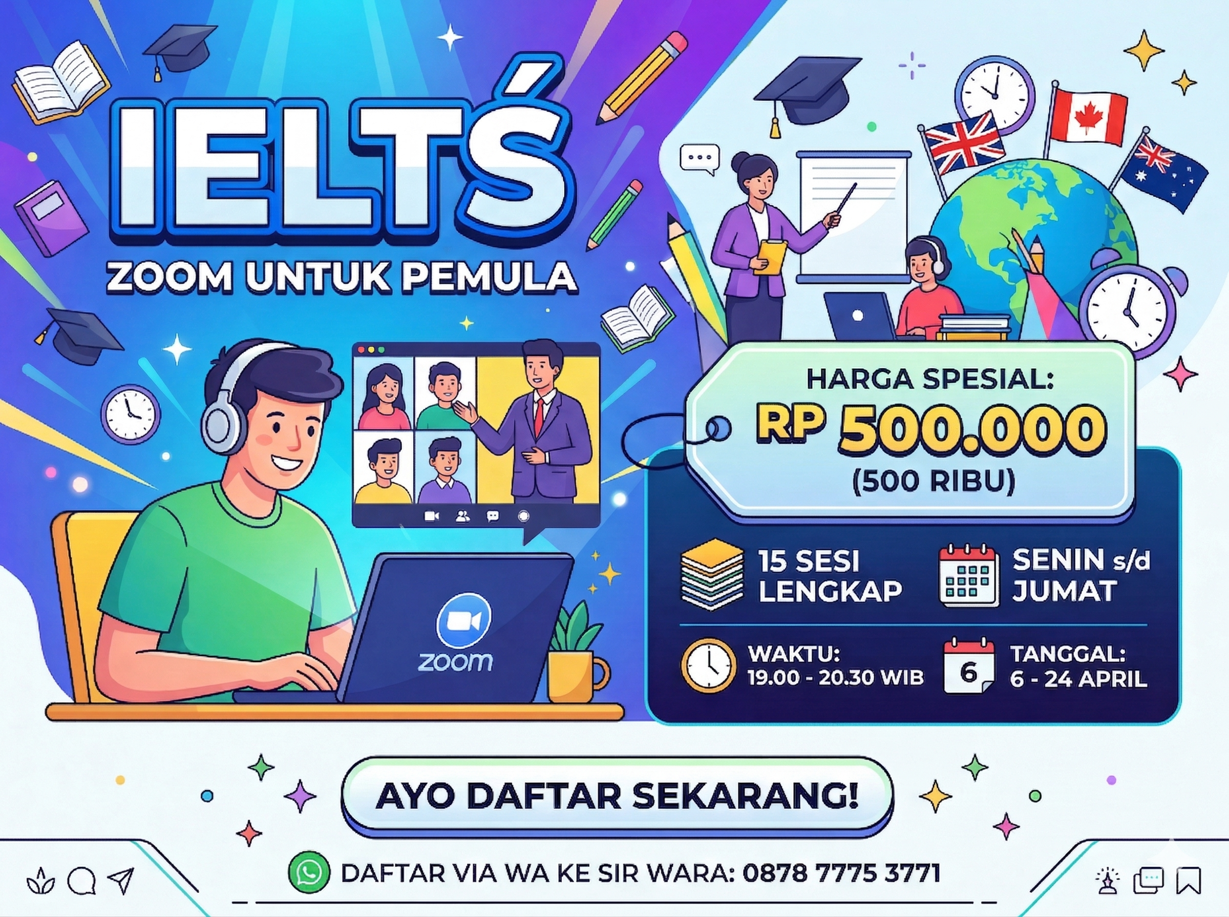 Banyak yang merasa frustrasi karena tidak tau kemana sebaiknya berguru dan belajar. Saya menawarkan diri menjadi guru anda. Karena saya punya pengalaman mengajar sejak 2006 dan saya punya skor TOEFL 670. IELTS 8.0 dan TOEIC 990. Saya paham kurikulum Cambridge. Pernah mengajar untuk IALF Bali dan Australia Awards, dan juga pernah mengajar untuk Kemenag dan Program Beasiswa LPDP. Selain itu saya juga sering diminta mengajar di lingkungan Kementerian Keuangan dan Puslitbang BMKG. Berminat belajar bersama Sir Wara?