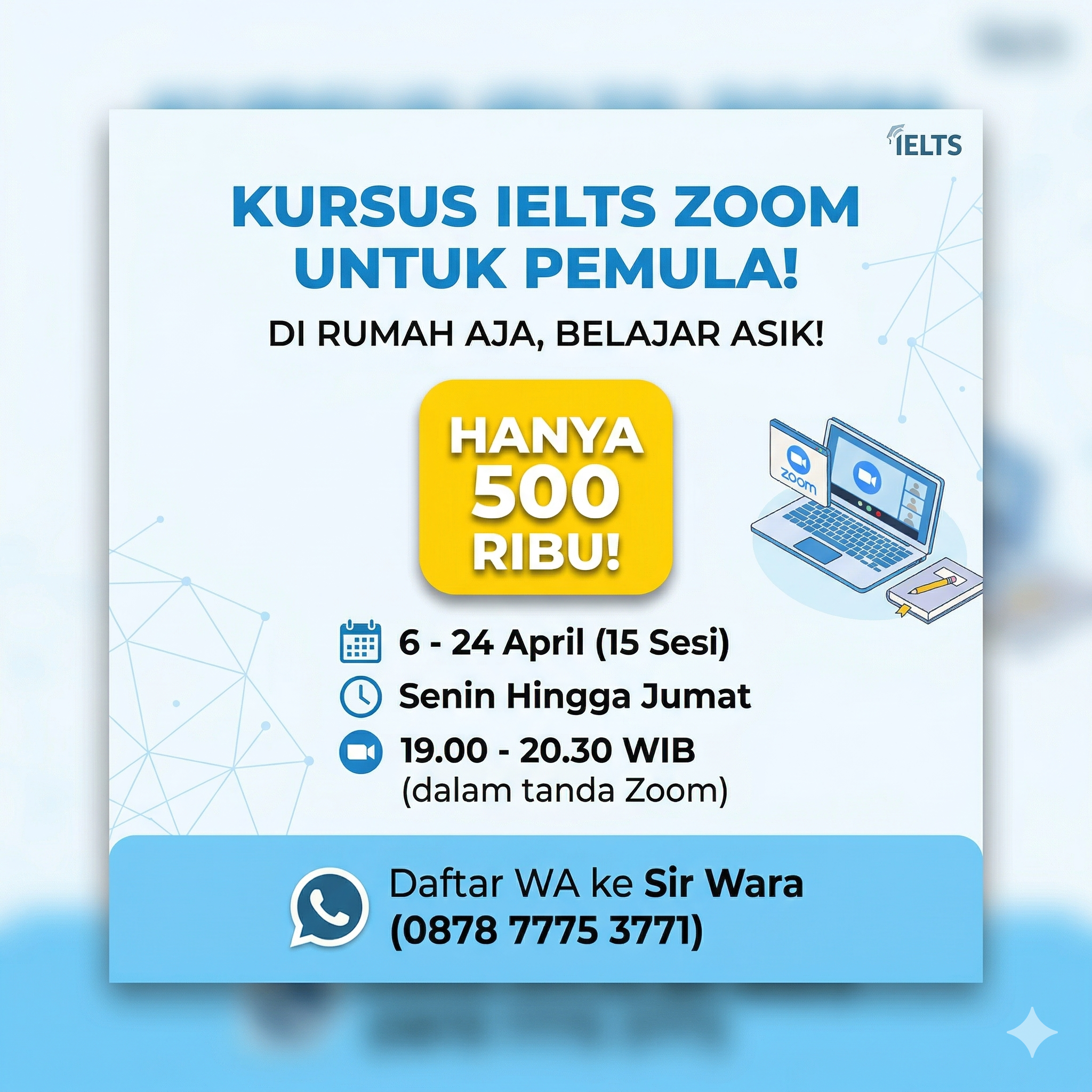 Tunggu apa lagi. Ayo gabung kelas Zoom Online TOEFL SUPERTOEFL! Hanya 500 rb untuk 1 orang mendapatkan 12 sesi zoom.