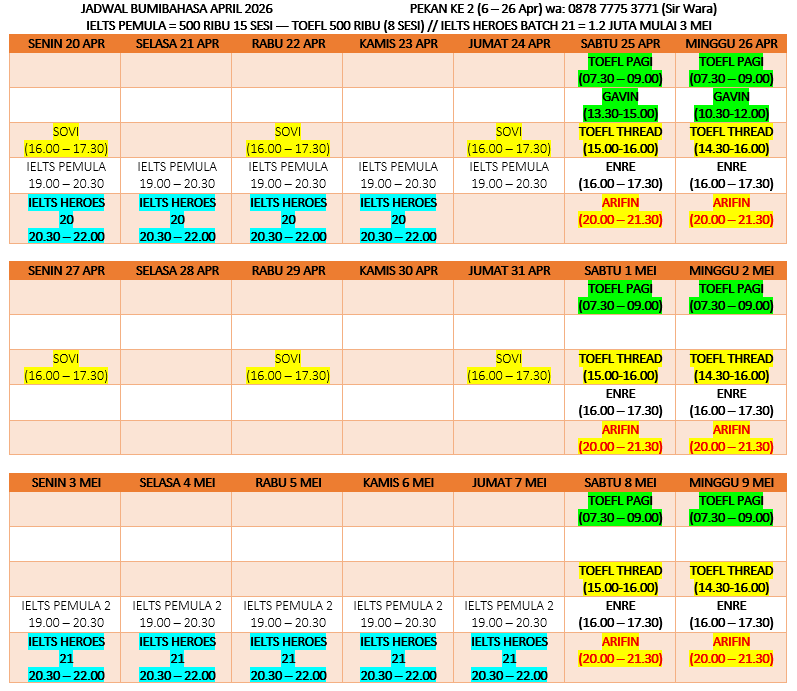 “ Ayo belajar bersama BUMIBAHASA. Bisa ambil kelas zoom onlinenya, hanya 500 ribu 1 batch (8 sesi zoom). Kalau tak punya uang bisa belajar dengan cara ikuti postingan blog dan sosmednya.“